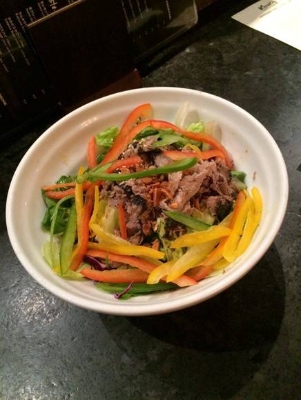 After that we had ‘Gyu shabu salad’. This salad consisted of iceberg lettuce, red, yellow and green peppers, and purple cabbage, the colours of the rainbow! Shabu-shabu beef was set on top with black sesame dressing. The beef was thinly sliced so each bite had a good ratio of meat to salad.